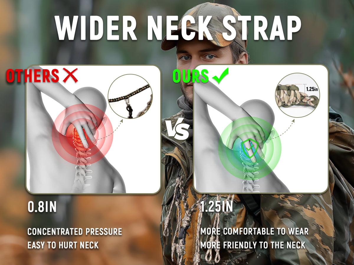 Large size easily fits around any neck, even with big bulky clothes, extremely comfort with wide, beefy neck strap.