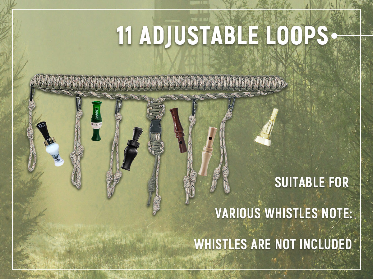 Adjustable loops that securely hold 11 calls in place. Also comes with upgraded REMOVABLE CLIPS, you can remove any unnessary loops according to your needs. Just insert your drop in the duck call groove and slide the knot down to secure your duck calls. Holds all sized calls, popular with Wood Duck Calls, Mallard Calls, Goose Calls, Teal Calls, and many others - won't bang your calls together and protects them from drops into the water and mud.