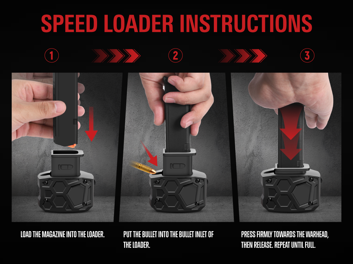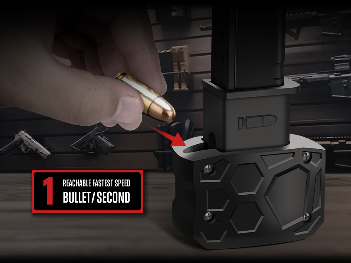 This magazine loader allows you to reload your Glock magazines in a simple and fast way. The last round is just as easy to load as the first. The whole reload process is not complicated at all and it's insert bullet, whack, insert bullet, and so on.The elderly can also easily fast reload.