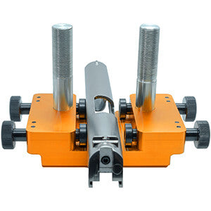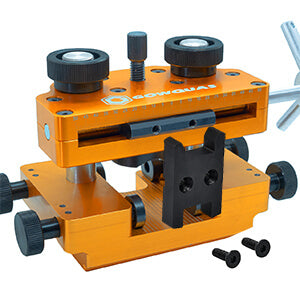 Fully recess all side knobs with the notched side of the bottom assembly facing you. Insert the slide into the bottom assembly, ensuring the front drop portion of the slide fits into the bottom notched area. Center the slide in the cradle and gradually advance all side knobs to loosely clamp in place.