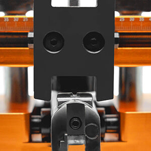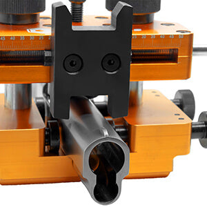 Once the slide aligns with the pusher block, slowly lower the top assembly. Use the height adjustment screw to align the bottom of the pusher block just above the slide's top. Turn the adjustment wheel and gently push the front pusher blocks against the side of the sight. Use the hash marks on the top front of the sight tool for estimation.