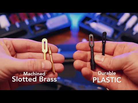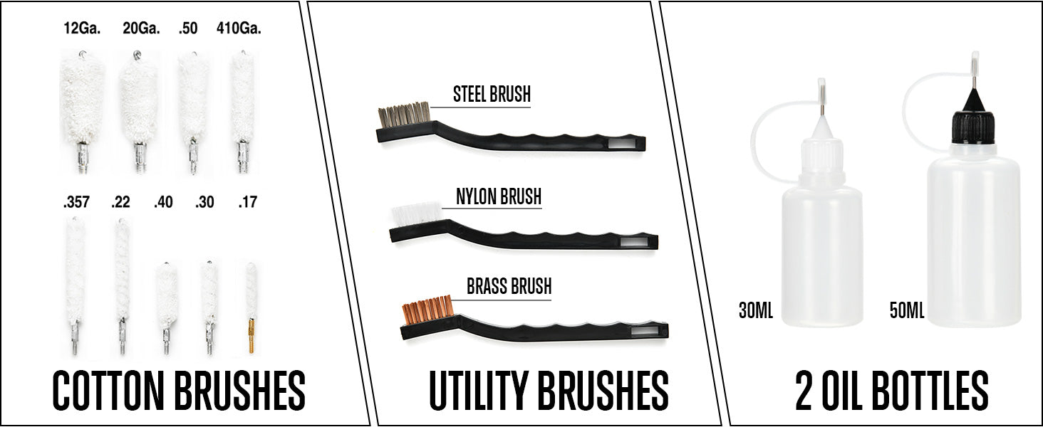 Includes 6 solid brass rods, 14 brushes, 9 mops, 12 spear-pointed jags, 1 black powder jag, 4 slotted patch loops, 3 utility brushes, 3 muzzle guards, 3 accessory adapters, 2 empty bottles, 50 3×3" cleaning patches, 4 polishing clothes.